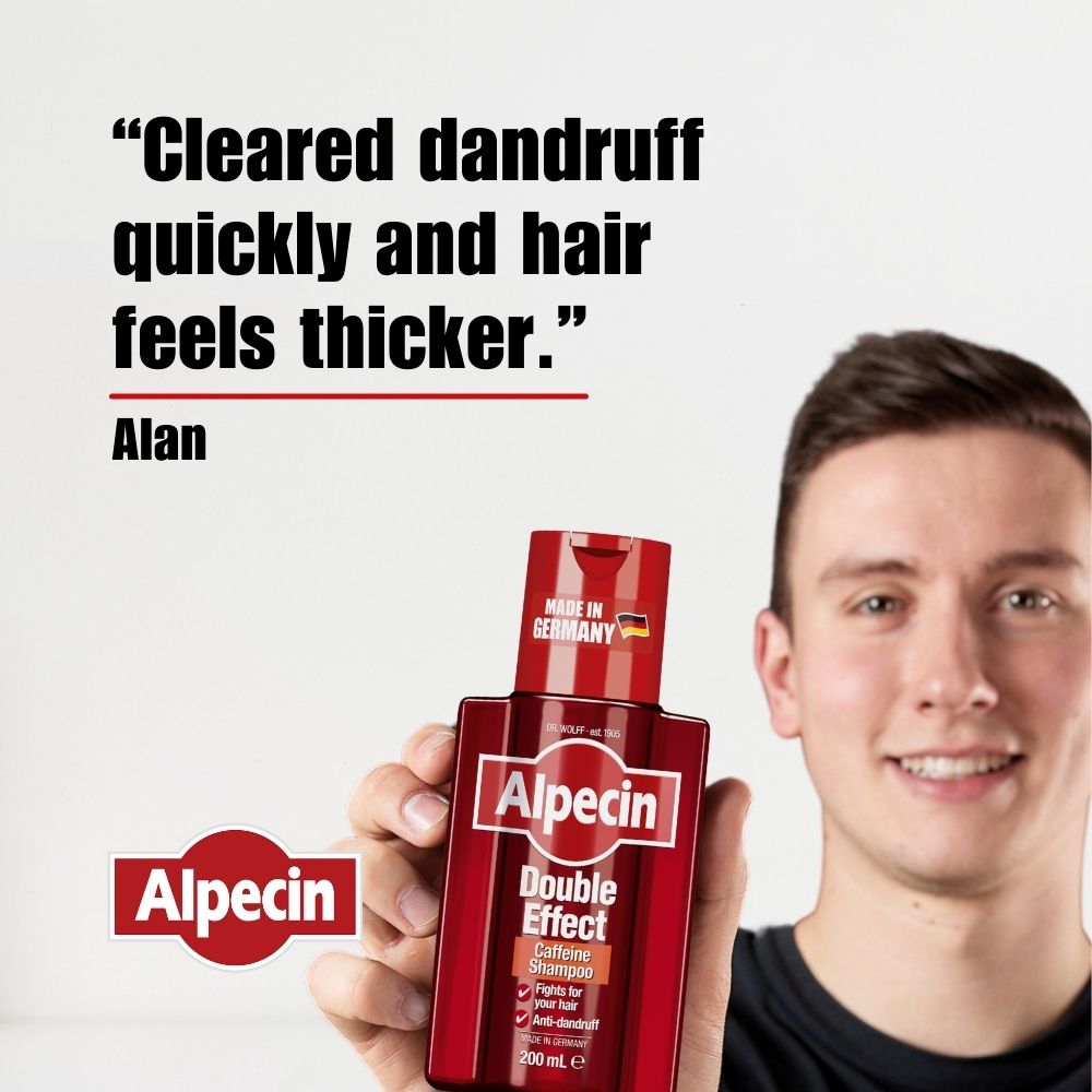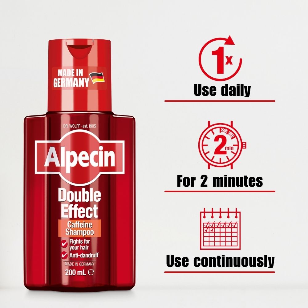 In the first step, the Alpecin Double Effect Caffeine Shampoo loosens scaly, horny cells and thoroughly removes dandruff from the scalp. This clears the way for the caffeine complex which remains on the scalp for up to 24 hours and promotes thicker, stronger hair.